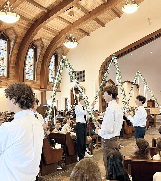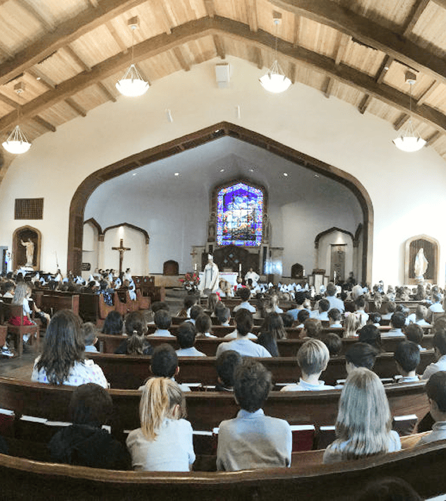 The first Mass was celebrated in the auditorium once the roof was completed, with the altar set on the stage facing Cecelia Terrace.